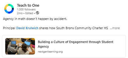 At New Classrooms, social media supported the launch and awareness of Teach to One Roadmaps. Posts highlighted classroom implementation stories, educator insights, and research about mathematics instruction.